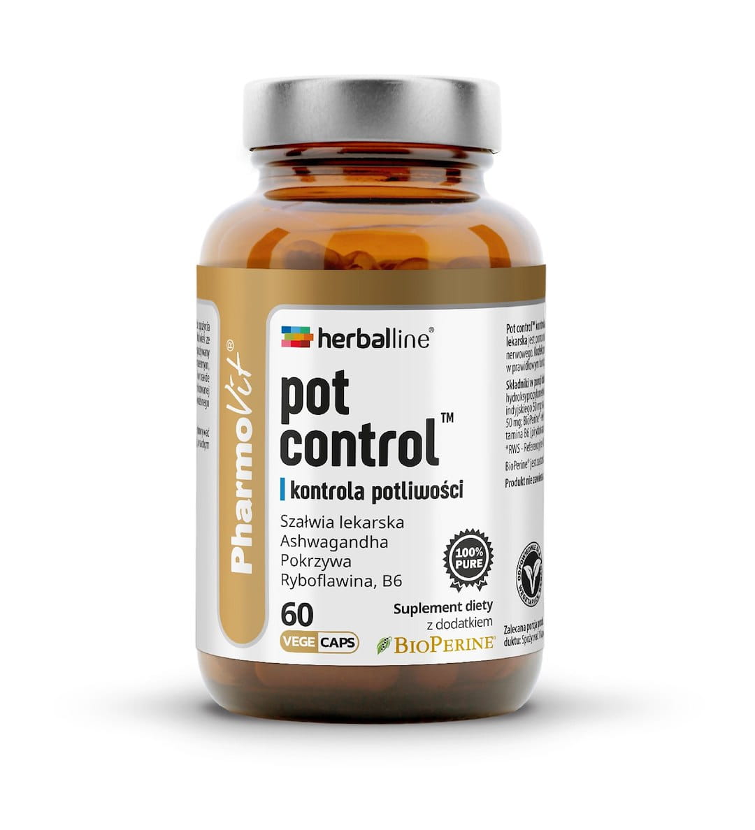 Potcontrol™ kontrola potliwości to kompozycja ekstraktów roślinnych, witamin oraz BioPerine®. Szałwia lekarska jest pomocna w łagodzeniu potliwości. Ashwagandha wspomaga organizm w stanach napięcia nerwowego. Kozłek pomaga zrelaksować się i utrzymać zdrowy sen. Ryboflawina i witamina B6 pomagają w prawidłowym funkcjonowaniu układu nerwowego.